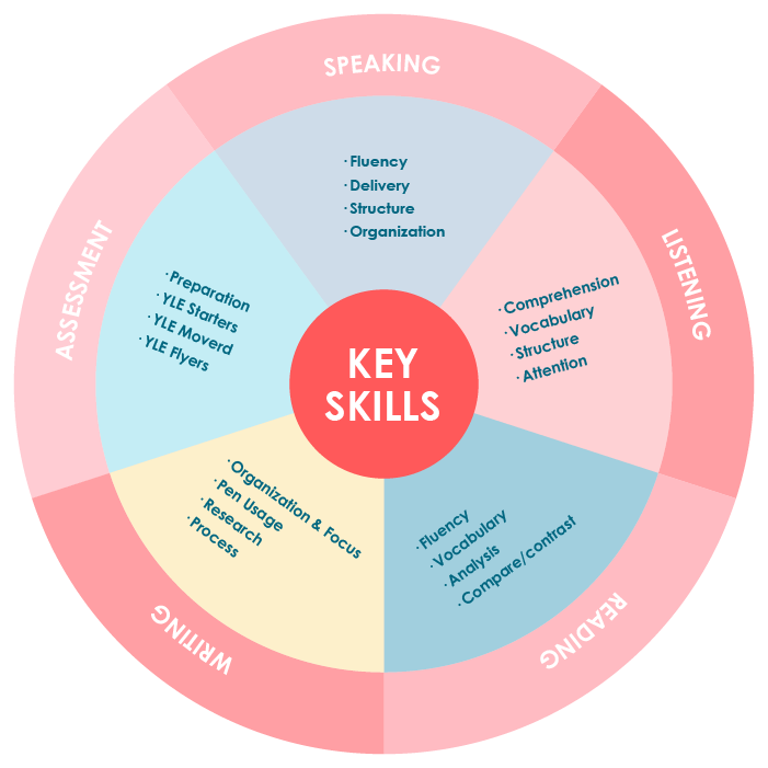 - يركز على تطوير مهارات الاستماع والتحدث والقراءة والكتابة، وكذلك تطوير المفردات والوعي اللغوي.
